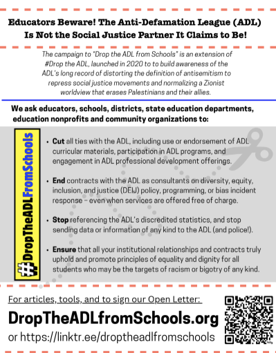 This is a document you can hand to educators and administrators who are looking for alternatives to the ADL. It explains why and how schools should approach replacing the ADL’s programming, curriculum, professional development, and consulting services. It provides vetting criteria to help select credible, principled resources on racism and antisemitism.